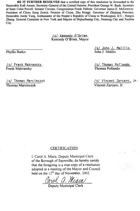 新澤西州賽瑞維爾市市議會通過的決議全文如下:
