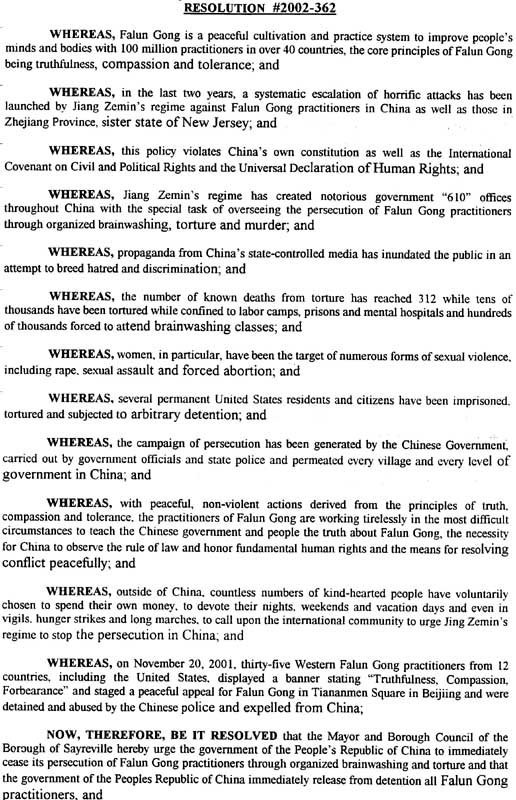 鑑於,在過去的兩年中,江XX政權發動了一場對中國法輪功學員的逐步升級的恐怖攻擊,受害者也包括新澤西姊妹州浙江省的法輪功學員;並且