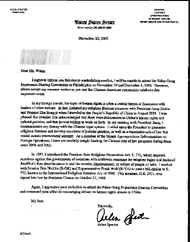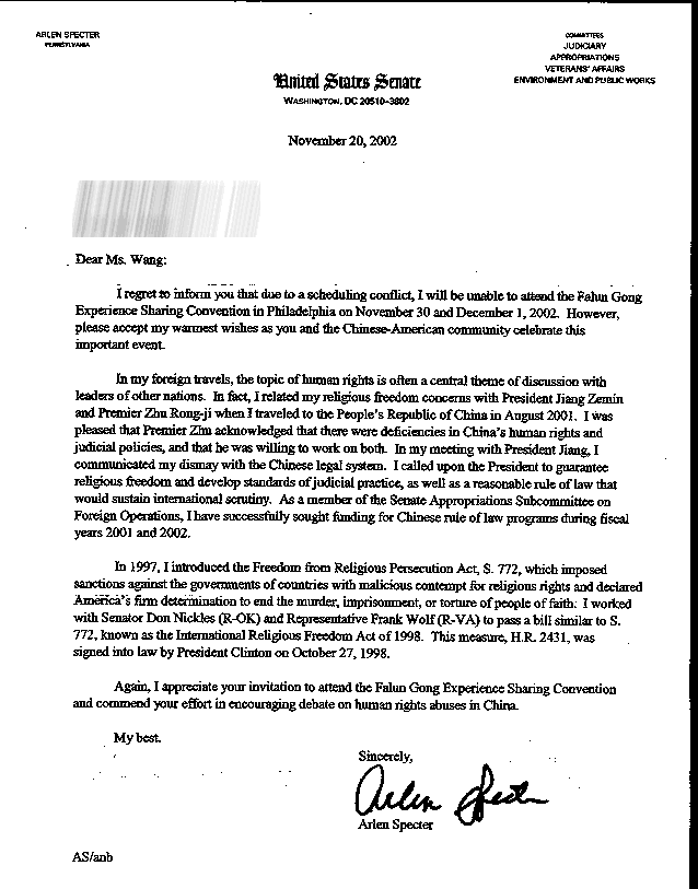 由於時間安排有衝突,很抱歉我不能夠參加11月30日及12月1日在費城召開的法輪功修煉心得交流會。但是,當你和華人社區共慶這一重要活動時,請接受我最熱烈的祝賀!