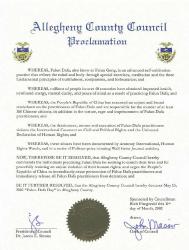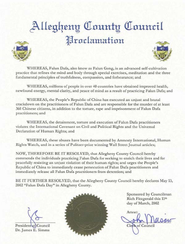 現因此作出決議:艾勒格尼(Allegheny)郡議會特此褒獎修煉法輪大法的人們,以表彰他們充實生活以及和平抵抗對他們人權的非公正的侵犯;並強烈要求中華人民共和國立即停止迫害法輪大法修煉者,立即釋放所有被拘留的法輪大法修煉者;並且