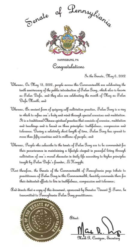 鑑於,賓夕法尼亞州人民將於2002年5月13日歡慶法輪功(也叫法輪大法)洪傳十週年,同時,他們還將慶祝五月的法輪大法月;並且