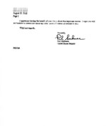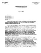就國會所採取的行動,我想確認您已了解到,眾議院最近通過了第188號決議案。這一議案表達了國會要求中國政府應立即停止對法輪功學員的迫害的意願,現已呈送參議院外交委員會,我也是這一委員會的成員之一。這一決議鼓勵美國政府在一切適當的場合敦促中國政府釋放被拘禁的法輪功學員,停止對所有的良心犯進行殘酷的,非人道的虐待,並允許法輪功學員追求自己的信仰。此外,這一立法呼籲美國政府調查中國(江XX)政府對在美法輪功學員進行非法騷擾的行為。您放心,如果負責制定委員會議程的參議院外交委員會主席同意在第107次國會上討論這一立法的話,我會參考您的建議。