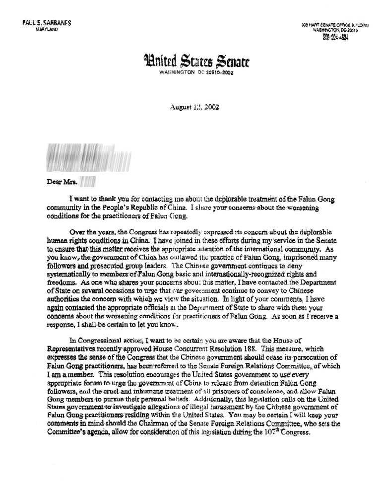 幾年來,國會不斷地表達了它對中國惡劣人權狀況的關注。在參議院任職期間,我一直在為確保此問題受到適當的國際社會的關注而努力。正如你所知,中國(江XX)政府取締了法輪功,許多學員遭到監禁,聯絡人受到迫害。中國(江XX)政府還在不斷地、系統地剝奪法輪功學員基本的,並得到國際公認的權利和自由。作為一名與您有共同憂慮的人,我曾多次與國務院聯繫,敦促我們的政府向中國官方表達我們對此事的關注。在您的建議下,我再一次聯繫了國務院有關官員,向他們轉達了您對法輪功學員處境不斷惡化的擔憂。一旦得到答覆,我將儘快轉告您。