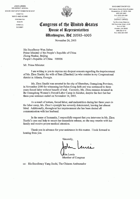 路易斯議員在致溫家寶的信中說,周雪菲是喬治亞州亞特蘭大市我選區內的居民呂朝暉的妻子。周雪菲女士於2000年11月在廣東省深圳市為實踐她對法輪功的信仰而被捕,在未經審判的情況下被勞教3年。目前,周雪菲女士仍然被關押在位於三水市的廣東省婦女勞教所,儘管她的3年勞教期已於2003年11月14日期滿。