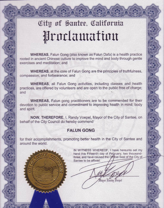 稱讚法輪功在聖迪市及世界各地為促進健康而取得的成就。
