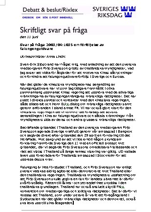 斯萬.艾利克就瑞典公民普瑞佑.斯文森被泰國政府關押一事向我提出問題,即我應當採取哪些措施防止來自中國的壓力並阻止對法輪功學員的迫害擴散到瑞典及歐洲。