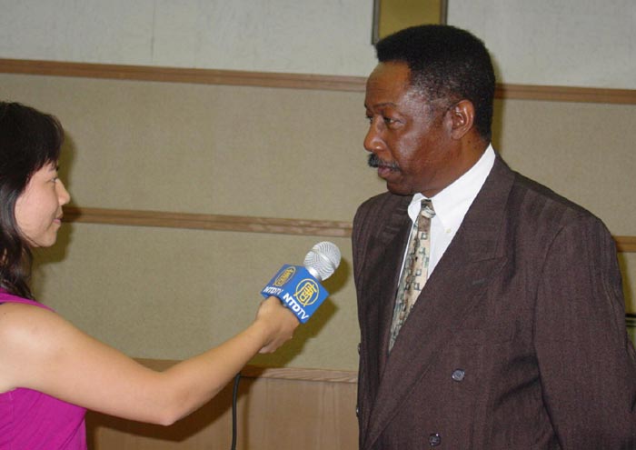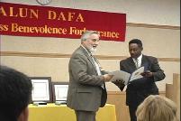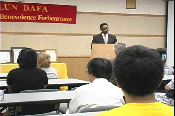 托尼-李先生在活動中代表史蒂夫-塞繆廉議員發言。並解釋說,由於史蒂夫-塞繆廉議員的日程表已經排滿,無法親自前來參加這次慶祝活動,所以特別派他前來表示祝賀。托尼在講話中說,我們當今的社會和社區都面臨著許多很難解決的問題,如毒品、暴力、犯罪等。法輪大法從「身體、思想和精神」全面提升人的做法會幫助解決這些問題。托尼還對學員表示,他對中國政府迫害法輪功的做法十分不理解,並強調美國是自由的社會,你們在這裏可以自由煉法輪功,法輪功對社會的貢獻會得到政府的鼓勵和表彰。托尼-李先生的講話博得在場觀眾的熱烈掌聲。學員代表向托尼-李先生及眾議員史蒂夫-塞繆廉先生贈送了大法書籍和教功錄像帶。托尼-李先生並當場接受了新唐人電視台的採訪。