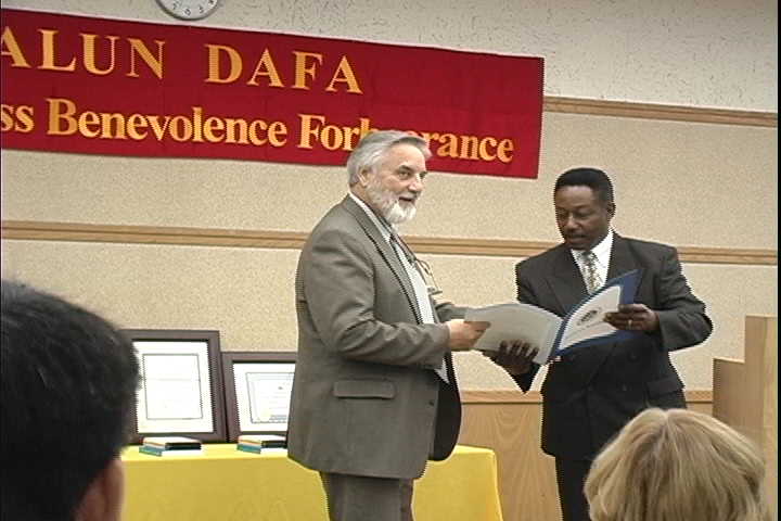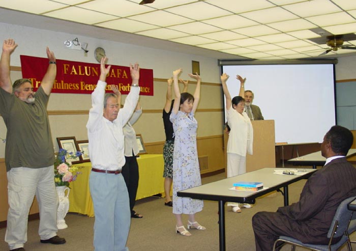 學員們當場對弗萊斯諾縣政府官員對大法的表彰和支持表示了衷心的感謝。慶祝活動還包括學員表演法輪功功法以及和議員代表一同觀看介紹大法的錄像片。