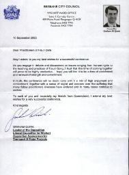 昆省黃金海岸省議員貝爾(A.J.D. Bell)在賀信中說,「法輪大法在黃金海岸的社區中享有充份的尊敬和支持,法輪大法做得很好,學員們非常熱情,也從他們的各項活動中有了很大的收益。希望這次交流會取得圓滿成功,願所有的參會者都從所交流的心得中得到啟發和鼓勵。」