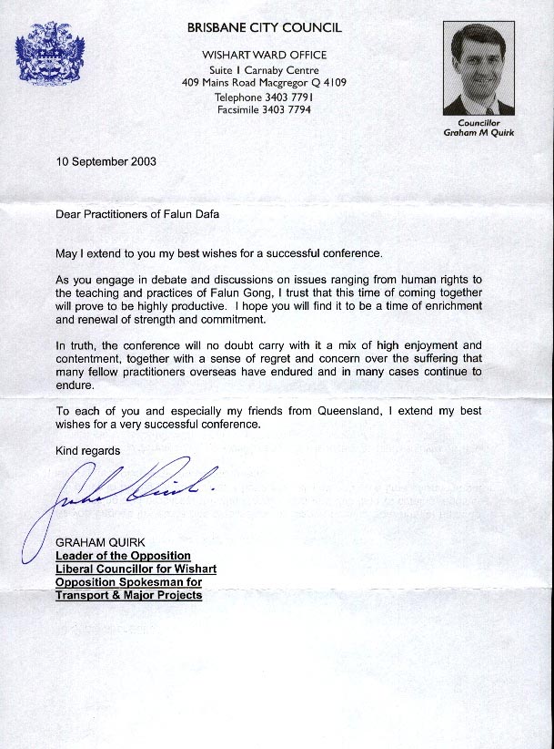 工黨領袖、交通和重大項目發言人奎克(Graham Quirk)在賀信中說,「在你們為人權和法輪功的修煉準則而努力奮鬥的時候,我相信在這樣時刻相聚在一起將會很有收穫。我希望你們會從中汲取更多並獲得新的力量投入你們的努力。事實上,這次心得交流會無疑既包含著滿足和幸福,也有著遺憾和關注,為著你們那些海外的同修們曾經經受過的苦難和許多正在承受痛苦的同修。讓我問候每一個參會的朋友……祝交流會圓滿成功。」