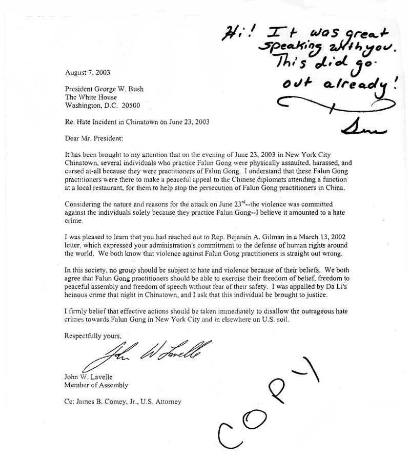 我被告知,2003年6月23日晚間在紐約市中國城,數名修煉法輪功的人士僅因為他們是法輪功學員而遭到人身攻擊、騷擾及謾罵。據我所知,這些法輪功學員當時是向在當地一家餐館舉行活動的中國外交官員進行和平請願,要求他們幫助制止對中國法輪功學員的迫害。