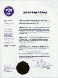 鑑於,法輪大法學員來到我市聲援全美營救月活動,營救美國公民查爾斯-李及在中國遭受酷刑的家人;並且