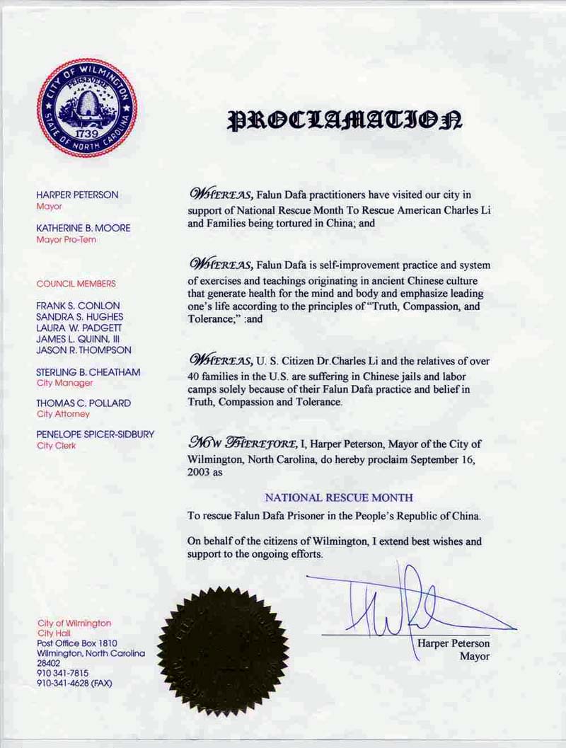 鑑此,我,北卡州威明頓(Wilmington)市市長,宣布2003年9月16日為威明頓市