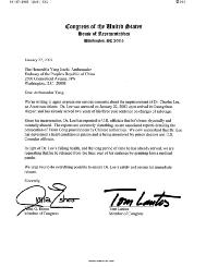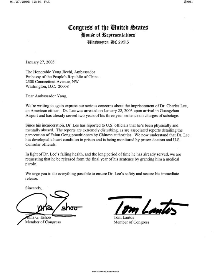 我們再次致函給您,表達我們對監禁美國公民李祥春醫生的嚴重關切。李醫生於2003年1月22日在抵達廣州機場時遭到逮捕,現已在獄中服刑兩年。他被控「破壞罪」遭判刑三年。