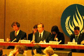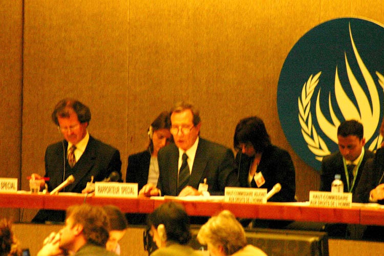 ![]() 圖解:聯合國「法官和律師的獨立性」特派專員萊安德羅•德斯波伊先生在2005 年的日內瓦人權會議上做報告 (左邊第二位)(special rapporteur on the independence of judges and lawyers) |