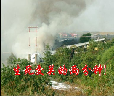 二. 逃離時,人們相互幫助,相互扶持,似乎是感動了上界生命──出現了兩分鐘的逃離時間,大概是等三次紅綠燈變換的時間,當最後一個空難中人逃離的瞬間,「沖天大火吞噬了整架飛機」。