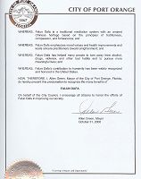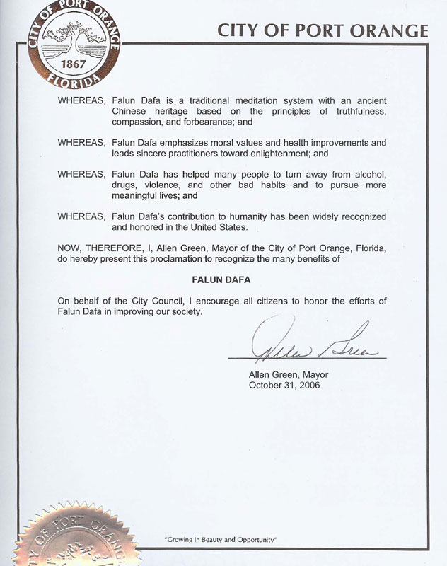 鑑此,我,艾倫﹒格林(Allen Green),佛羅里達州橙港市(City of Port Orange)市長,褒獎法輪大法的諸多益處。