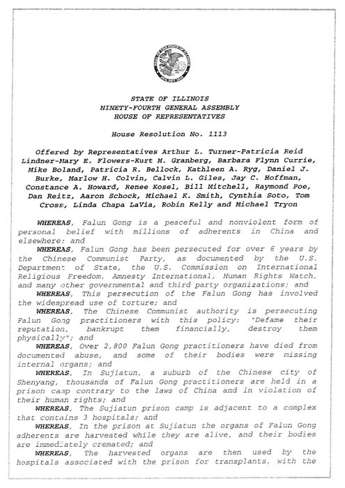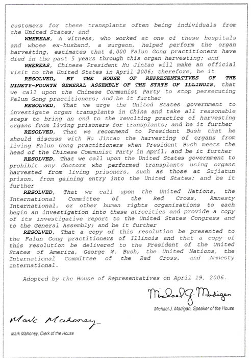 決議:將此決議文一份副本交與伊利諾伊的法輪功修煉者,並分別送達一份副本給美國總統喬治•W•布希、聯合國、國際紅十字會和國際大赦。