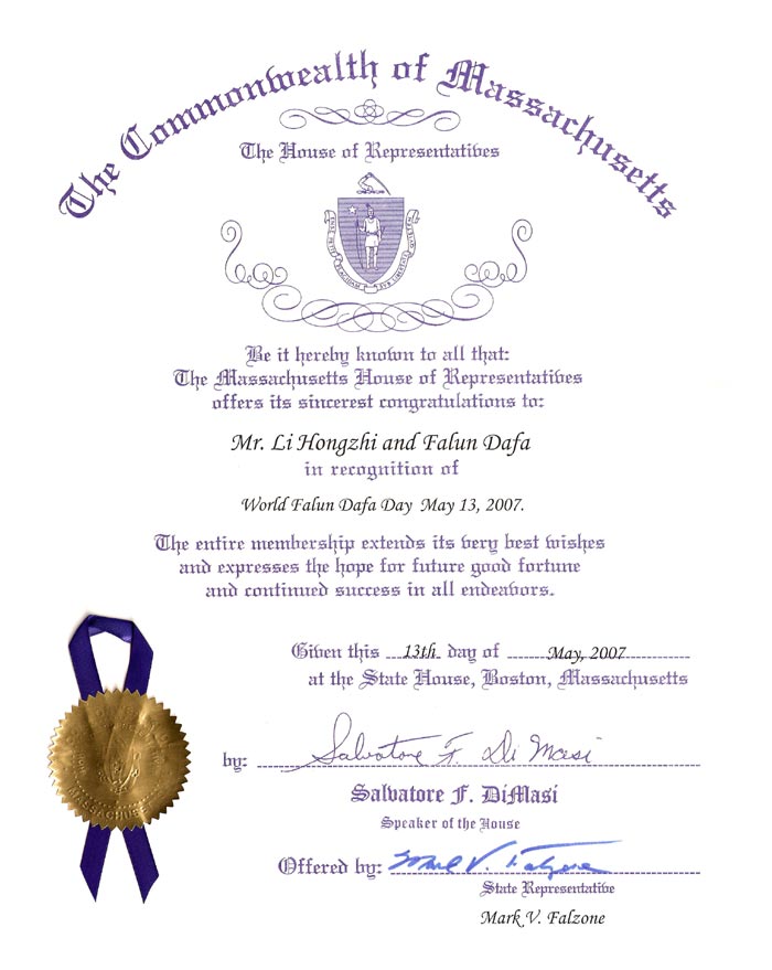 馬薩諸塞州眾議院向李洪志先生及法輪大法致以最衷心的祝賀!
