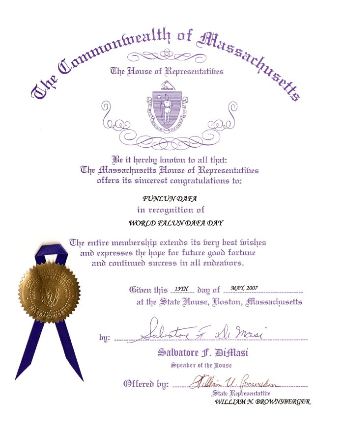 特此公告: 馬薩諸塞州眾議院向法輪大法致以最衷心的祝賀! 褒獎二零零七年五月十三日為世界法輪大法日