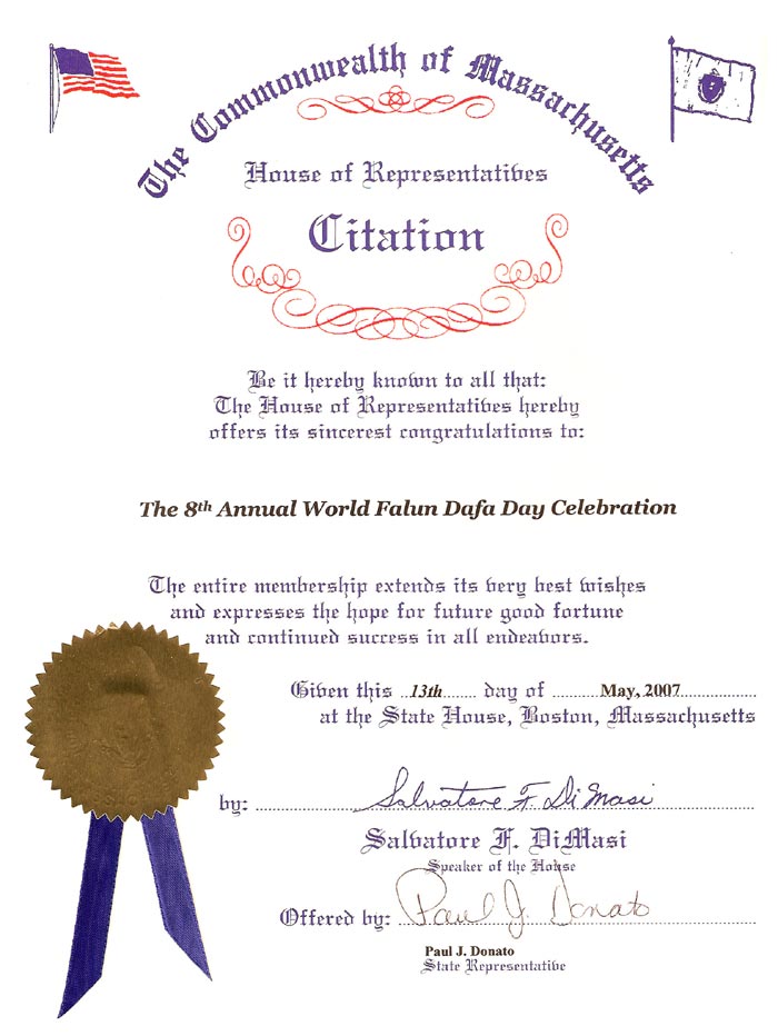 馬薩諸塞州眾議院向法輪大法致以最衷心的祝賀!