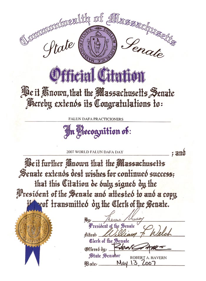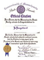 麻州參議院獻上最美好的祝願,祝不斷取得成功。此褒獎狀由參議院主席簽署並由參議院秘書作證明和傳遞。