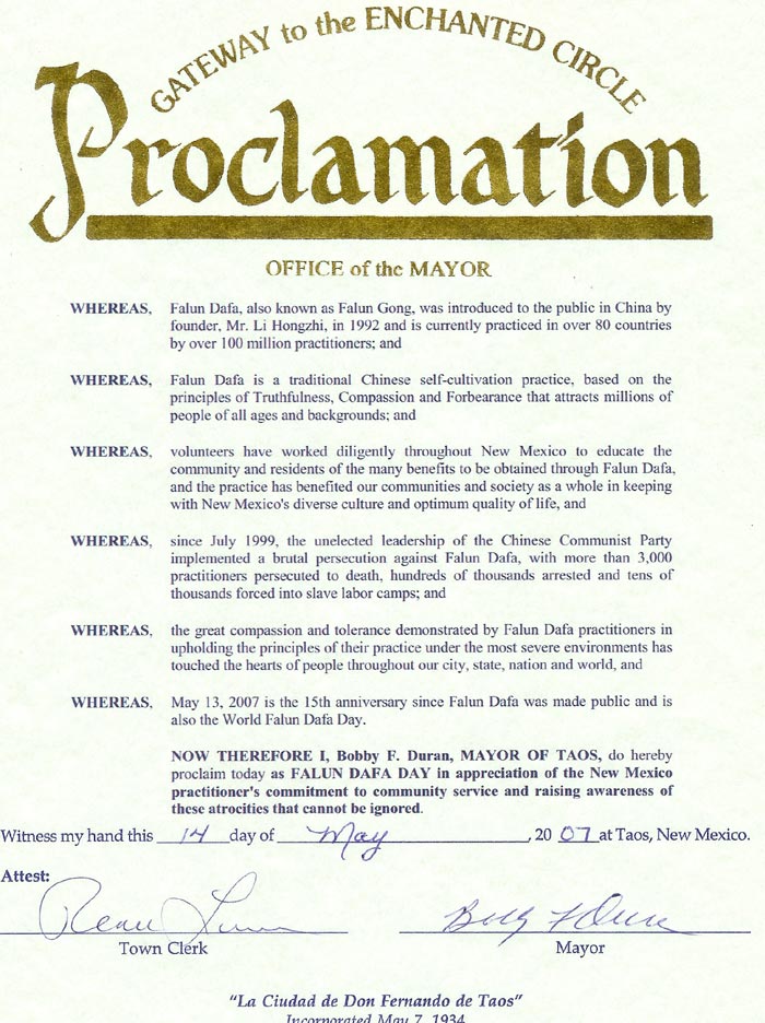 以嘉獎新墨西哥州的法輪功學員對社區服務作出的奉獻,以及讓人們了解這些不能忽視的暴行。