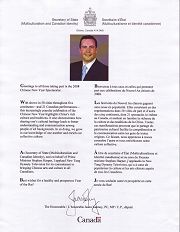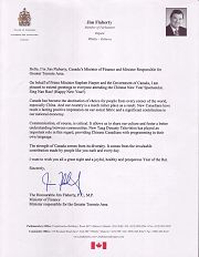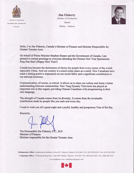 財政部部長吉姆•福萊赫提(Jim Flaherty)同時兼任大多倫多地區事務部長。他在賀信中表示,代表總理斯蒂芬.哈珀和加拿大政府,他非常高興能夠向每一位參加全球華人新年晚會的觀眾表示問候和祝賀。