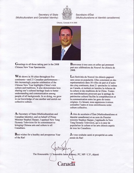 多元文化部部長傑森•肯尼(Jason Kenney)在他的賀信中表示,作為加拿大多元文化部長,他代表斯蒂文•哈珀總理,為新唐人電視台所承擔的責任和努力,將中國的傳統文化和藝術帶給加拿大而喝彩。