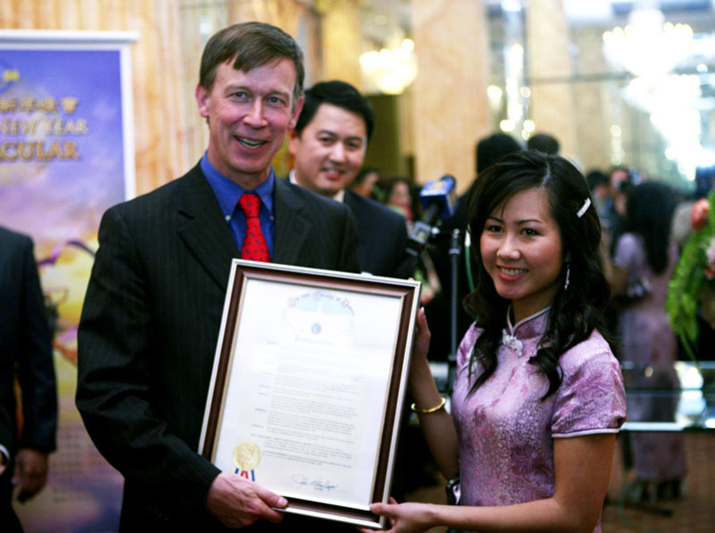 丹佛市長約翰•西根陸坡(John W. Hickenlooper)親臨貴賓招待會,並發表講演。他稱讚新唐人電視台在幫助海外中國人適應和溶入主流社會和媒體世界的信息自由和多元化的貢獻。也非常敬佩神韻藝術團為幫助人們找回正統中國傳統文化所做的努力。