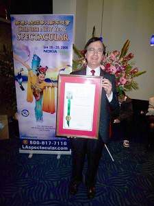 ![]() 加州眾議員曼多沙的資深代表拉利﹒卡波拉羅曼到場為新唐人電視台頒發褒獎。 |