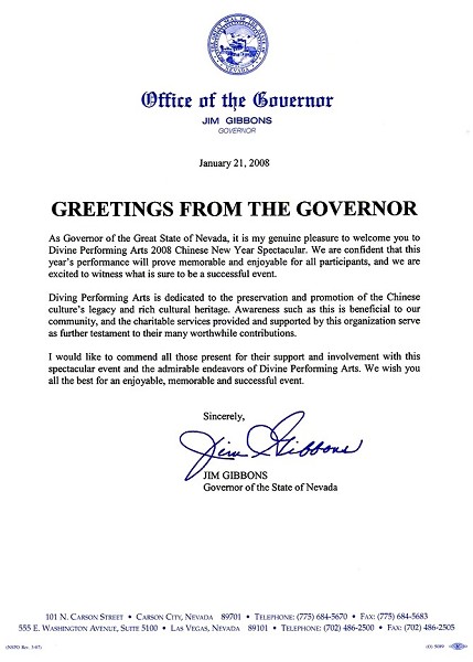 ![]() 內華達州長吉本斯發來賀信,熱烈歡迎神韻藝術演出團的到來,稱將懷著激動的心情見證這個註定成功的晚會 | ![]() 內華達州長吉本斯的賀信原文 |