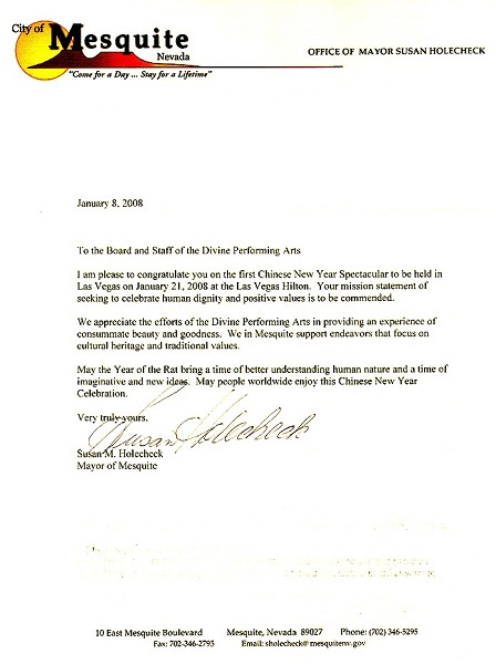 內華達州馬斯奎特市(Mesquite)市長蘇珊•霍爾切克(Susan Holecheck)給神韻藝術團的演員和工作人員發來賀信,讚揚神韻藝術團為褒揚人類高尚品格和正面價值所做出的努力。