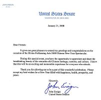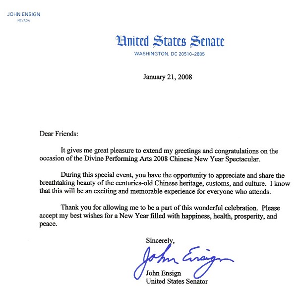 內華達州聯邦參議員約翰•恩賽(John Ensign)在給晚會的賀電中表示:「我感到非常榮幸能在神韻藝術團二零零八年全球華人新年晚會演出期間致以問候與祝賀。在神韻演出期間,我們將得到一個可以欣賞和分享美麗燦爛中國古老文化的良機,我知道這對每一個來看演出的人來說都將是一個興奮而難忘的新體驗。」
