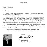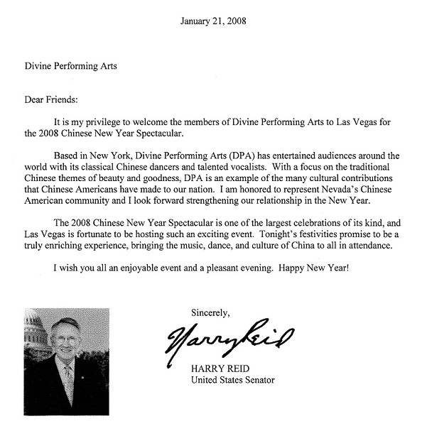 內華達州聯邦參議員哈利•瑞德(Harry Reid)在賀信中說:「神韻藝術團以一流的舞蹈家和有才賦的聲樂家,使全世界的觀眾感到歡愉。聚焦於傳統中國文化的美妙和優良,神韻藝術團是華裔為美國多元文化做出貢獻的楷模。我以能夠為內華達州的華裔褒獎而感到光榮,並且我期待能在新的一年裏更加增強我們之間的友誼。」