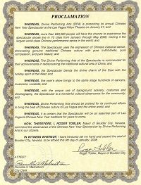 【明慧網二零零八年一月二十一日】二零零八年一月二十一日,新唐人全球華人新年晚會將在拉斯維加斯的希爾頓劇院(Hilton Theatre)隆重登場,美國內華達州博爾德(Boulder)市長羅傑•托布勒(Roger Tobler)特為晚會發來褒獎。褒獎令譯文如下: