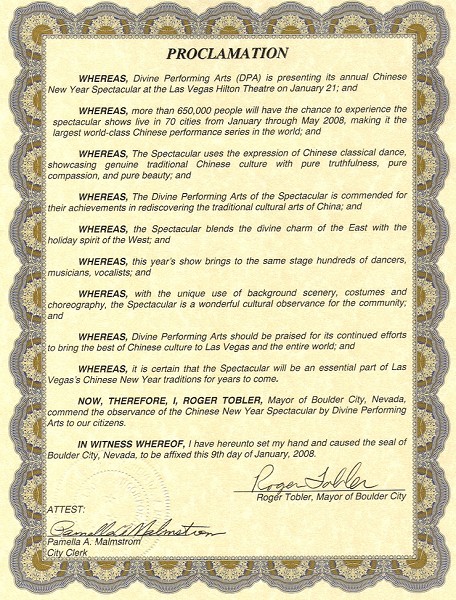 鑑於:神韻藝術團為傳遞中國傳統文化,不遺餘力的在拉斯維加斯與世界各地表演,應備受讚賞;