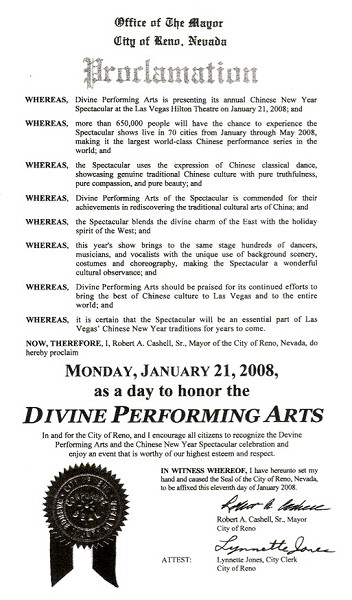 因而,此時此刻,我,羅伯特•凱塞爾,內華達州雷諾市市長,在此宣布:二零零八年一月二十一日,星期一,為神韻藝術團榮譽日。