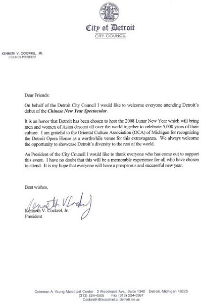 底特律市議會主席肯尼斯•V•考克雷爾(Kenneth Cockrel)在賀信中表示:「在底特律市舉辦二零零八年華人新年晚會並慶祝具有五千年悠久歷史的中華文化是底特律市的榮耀。我對東方文化協會選擇在底特律歌劇院舉辦這台高水平晚會深表謝意。」「作為市議會主席,我謹向支持和來欣賞這台晚會的每一位嘉賓表示感謝。毫無疑問,每一位欣賞新年晚會的朋友將會留下難忘的記憶。祝朋友們新年發達和成功。」