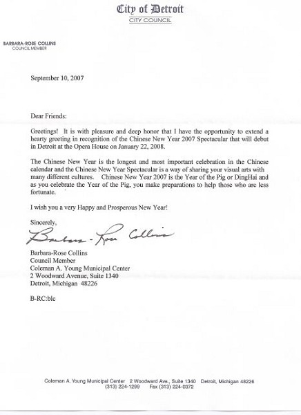 底特律市議會議員芭芭拉•羅絲•考琳斯(Barbara Rose Collins)在賀信中表示「能有機會恭賀二零零八年華人新年晚會於二零零八年一月二十二日在底特律歌劇院隆重演出,深感榮幸和欣慰。」她說:「中國新年是華人最重要的節日,具有悠久的歷史。華人新年晚會是與其他族裔分享中華文化藝術的一種有效途徑。二零零八年是農曆鼠年。在慶祝鼠年到來之際,華人新年晚會將為人們帶來好運。」