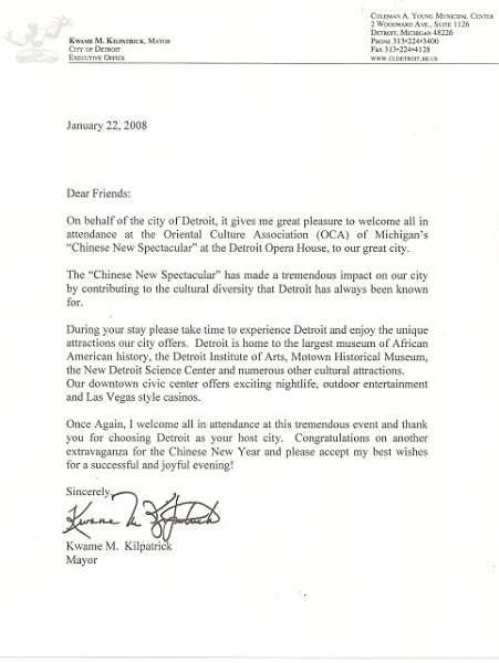 底特律市長科威明•基派崔克( Kwame Kilaptrick)在賀信中表示他代表底特律市非常榮幸的歡迎 「全球華人新年晚會」在底特律歌劇院舉行。信中說:「『全球華人新年晚會』藉著多元文化的傳遞帶給底特律市巨大的震撼,就如同底特律市長久以來被大眾所認同的一般。」