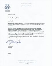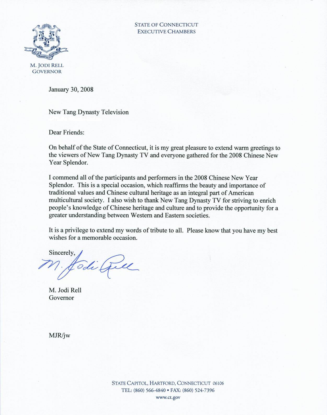 Jodi在信中說:「我代表康涅狄格州非常愉快的向新唐人電視台的觀眾,以及二零零八年神韻晚會的每一位觀眾,致以良好的祝願。」