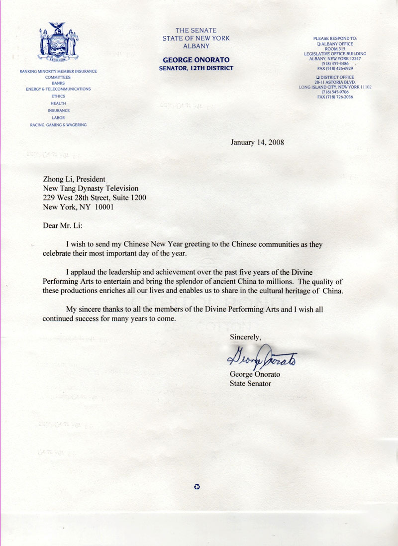 George說:「神韻藝術團在過去五年中將古老中國的神韻帶給千百萬的民眾,我祝賀你們取得的成就。這些傑出的節目豐富了我們的生活,並讓我們能夠分享中國傳統文化。」