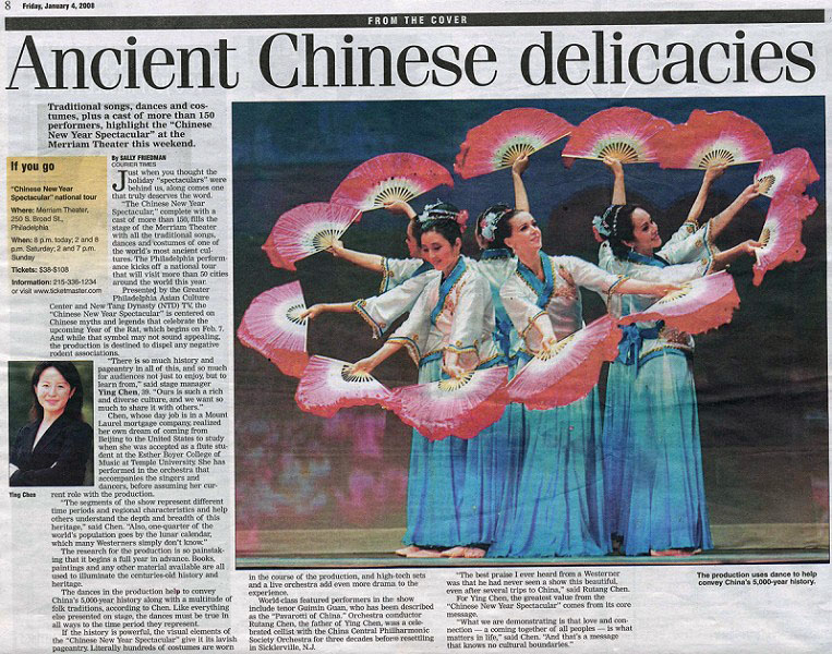 記者莎麗•福裏德曼(Sally Friedman)撰文說,當人們覺的(感恩節和聖誕節)的節日壯觀景象已經過去了的時候,這個真正稱的上「壯觀」的晚會(註﹕全球華人新年晚會的英文名字)終於來臨了。傳統歌曲、舞蹈和服飾,以及超過一百五十人的演出陣容,突出展現了美麗安劇院這個週末的「全球華人新年晚會」。費城的演出開啟了今年世界五十多個城市巡迴演出的序幕。