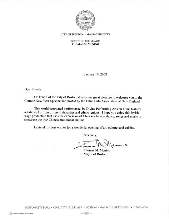 我代表波士頓非常高興歡迎你們前來欣賞新英格蘭法輪大法協會主辦的華人新年晚會。