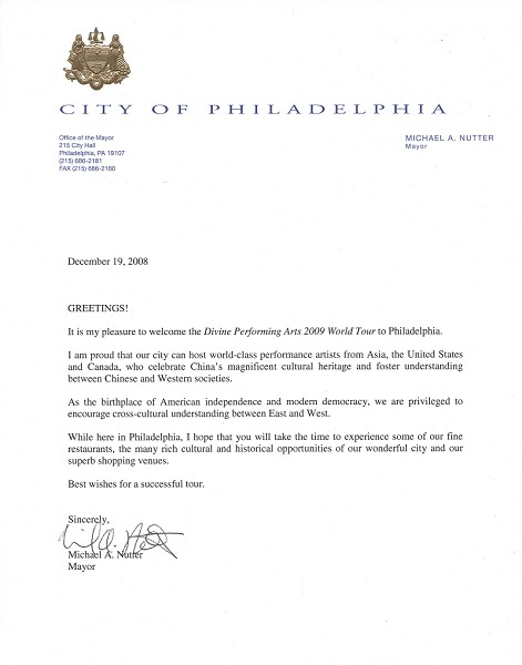 費城市長麥克爾•納特(Michael A. Nutter)在他的賀信中說,很高興歡迎神韻二零零九年全球巡演來到費城。