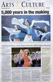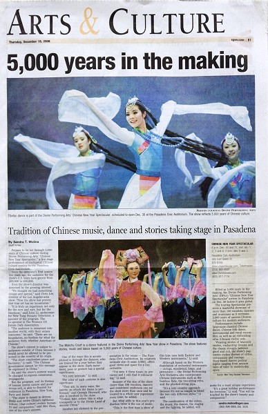 ![]() 帕薩迪納星報《Pasadena Star》十二月十八日以將近整版的篇幅圖文並茂的介紹了神韻晚會演出的特色、內容、時間和地點 |