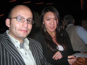 【明慧網二零零八年二月六日】(明慧記者周容紐約報導)二零零八年二月五日晚,在紐約無線電城音樂廳,年輕的杜若竹輕聲的向同學HAN解釋在舞台上演出的「新唐人華人新年晚會」《創世》的節目內容。