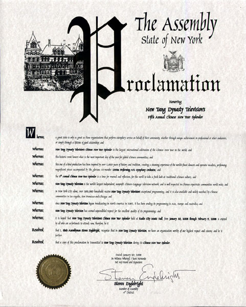 ![]() 紐約州眾議員斯蒂文•恩格爾布萊特的褒獎令 |