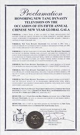 鑑於,新唐人電視台成立六年來,向觀眾提供了真實、客觀的資訊,豐富人們的知識和生活,為中文媒體業達到資訊自由流通和多元化貢獻力量,促進東西方的文化交流,並幫助海外華人適應和融入主流社會;並且,